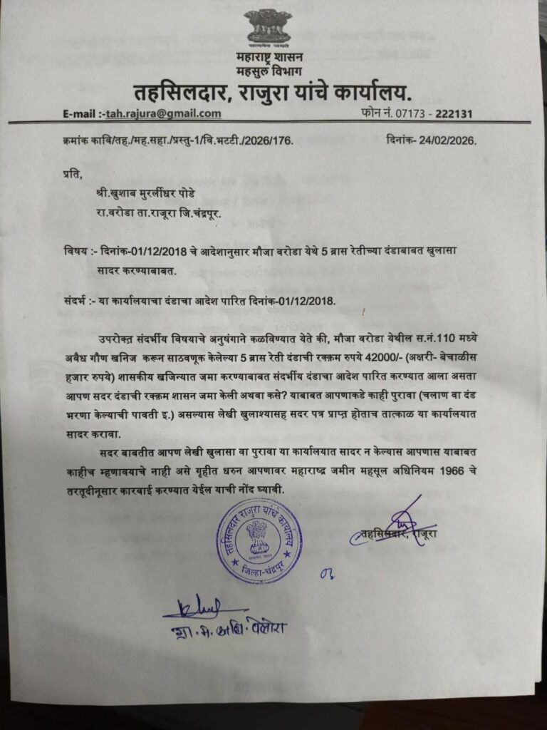 🚨तहसीलदार राजुरा यांनी याबाबत वरोडा पोलिस पाटील खुशाब पोडे यांना नोटीस दिला असून दंड व शास्तीचे प्रकरणाचे दस्ताऐवज राजुरा तहसील कार्यालयातुन गहाळ प्रकरणाची चौकशी सुरू असून लवकरच कारवाई करण्यात येईल.