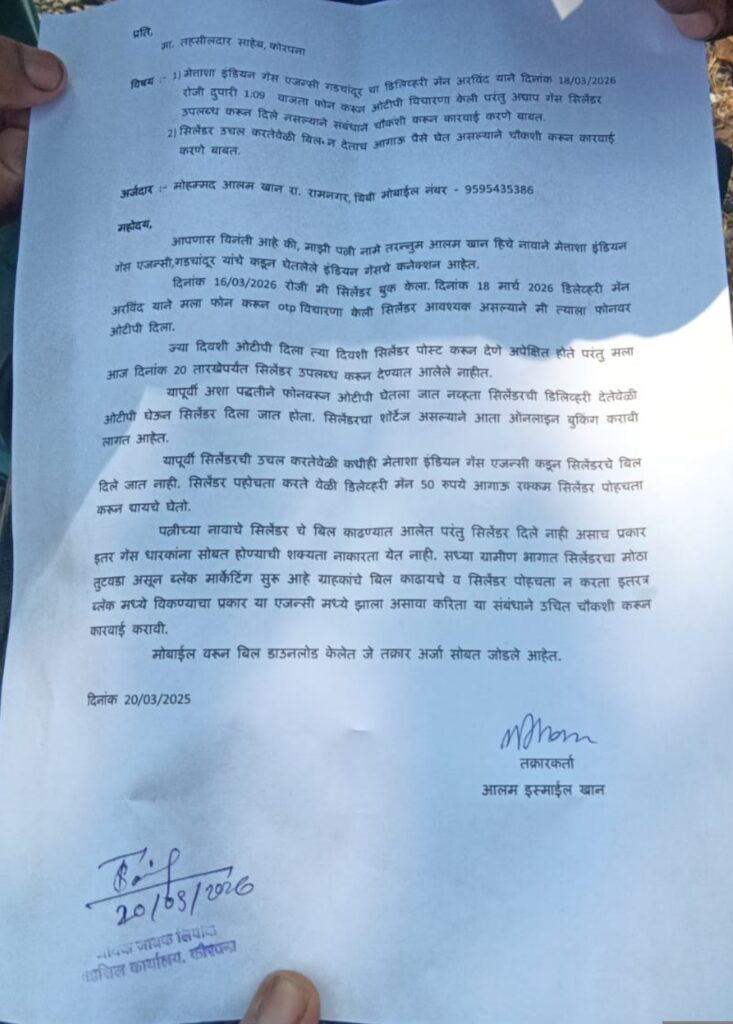 👉”16 मार्चला सिलेंडर बुक केले 18 मार्च रोजी ओटीपी घेतला सिलेंडर डिलेव्हर झाल्याचा मेसेज आला प्रत्यक्षात सिलेंडर मिळाले नाही याबाबत विचारणा केली असता सध्या स्टॉप नाहीत असे सांगण्यात आले तक्रार केल्यानंतर एजन्सी कडून सांगण्यात आले चुकी झाली. अजून पर्यंत सिलेंडर पोचता करून देण्यात आले नाही सिलेंडरची बेभाव विक्री सुरू आहे काळाबाजारी थांबविण्याकरिता तहसील प्रशासनाने लक्ष देण्याची गरज आहे.