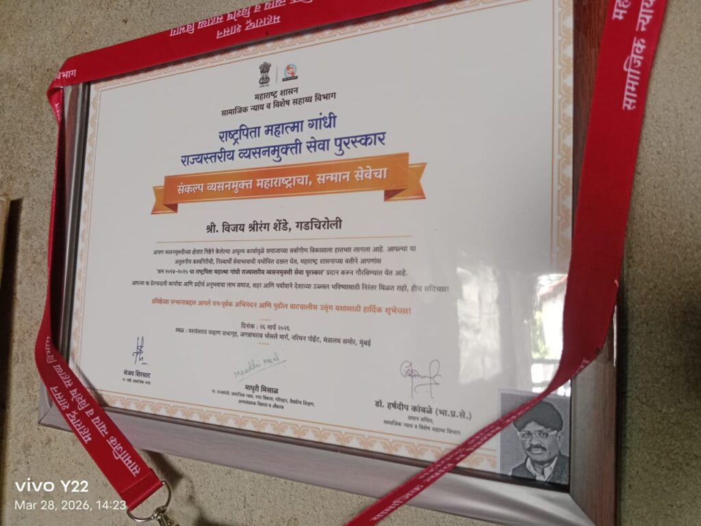 गडचिरोली:-सामाजिक न्याय व विशेष सहाय्य विभागाच्या वतीने व्यसनमुक्ती क्षेत्रात उल्लेखनिय कार्य करणार्या व्यकीना राष्ट्रपिता महात्मा गांधी राज्यस्तरीय व्यसनमुक्ती सेवा पुरस्कार दिल्या जातो अश्यातच चुरमुरा गडचिरोली येथील गायक व वेशनमुक्तीचे कार्य करणारा विजय शेंन्डे यांना २६ मार्च रोजी यशवंतराव चव्हाण प्रतिष्ठान सभागृह मुंबई येथील कार्यक्रमात मान्यवरांचा हस्ते पुरस्कार देण्यात आला.