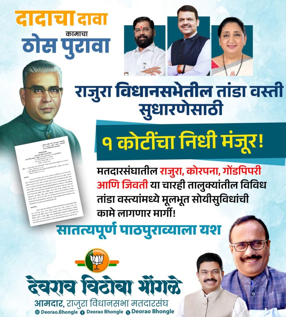 राज्य शासनाच्या इतर मागास बहुजन कल्याण विभागाने २७ मार्च रोजी निर्गमित केलेल्या शासन निर्णयानुसार, राजुरा विधानसभा मतदारसंघातील राजुरा, कोरपना, गोंडपिपरी आणि जिवती या चारही तालुक्यांतील विविध तांडा वस्त्यांमध्ये मूलभूत सोयीसुविधांची कामे मार्गी लागणार आहेत.