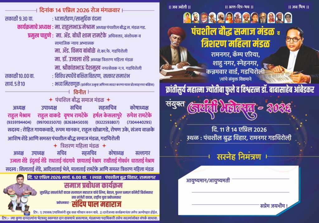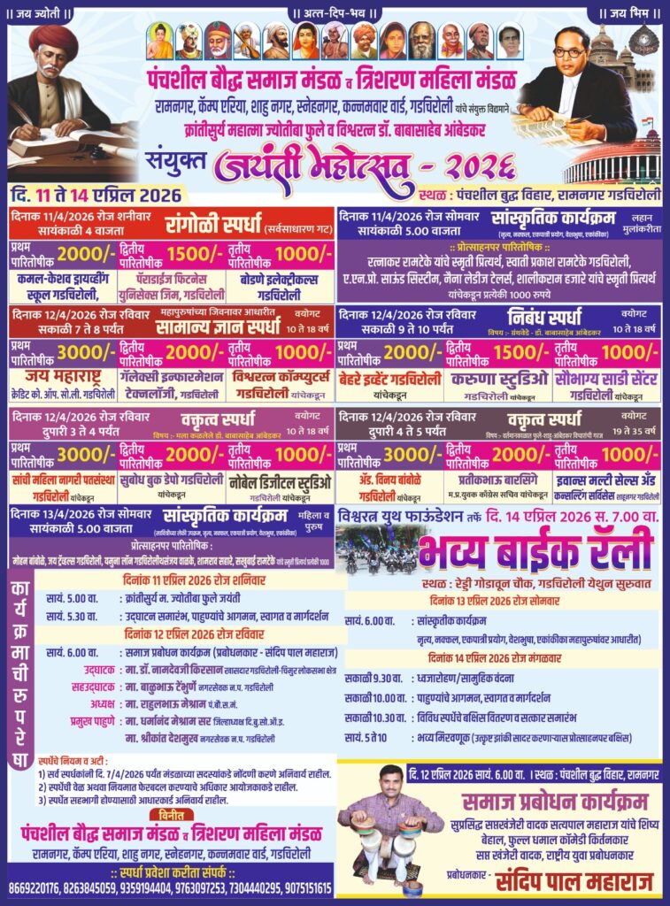 तरी होवू घातलेल्या भरगच्च कार्यक्रमात उपस्थित राहण्याचे आवाहन पंचशिल बौद्ध समाज मंडळ रामनगरचे अध्यक्ष राहुल मेश्राम उपाध्यक्ष राहुल वाकडे सचिव वृषभ रामटेके सहसचिव हर्षल केसलापुरे कोषाध्यक्ष रुपेश रामटेके राहुल खोब्रागडे रोशन उके आशिष शेंन्डे महिला मंडळाच्या पदाधिकारी डॉ. उज्वला शेंन्डे राधा नांदगाये धाराबाई मेश्राम आदिनी केलेले आहे.