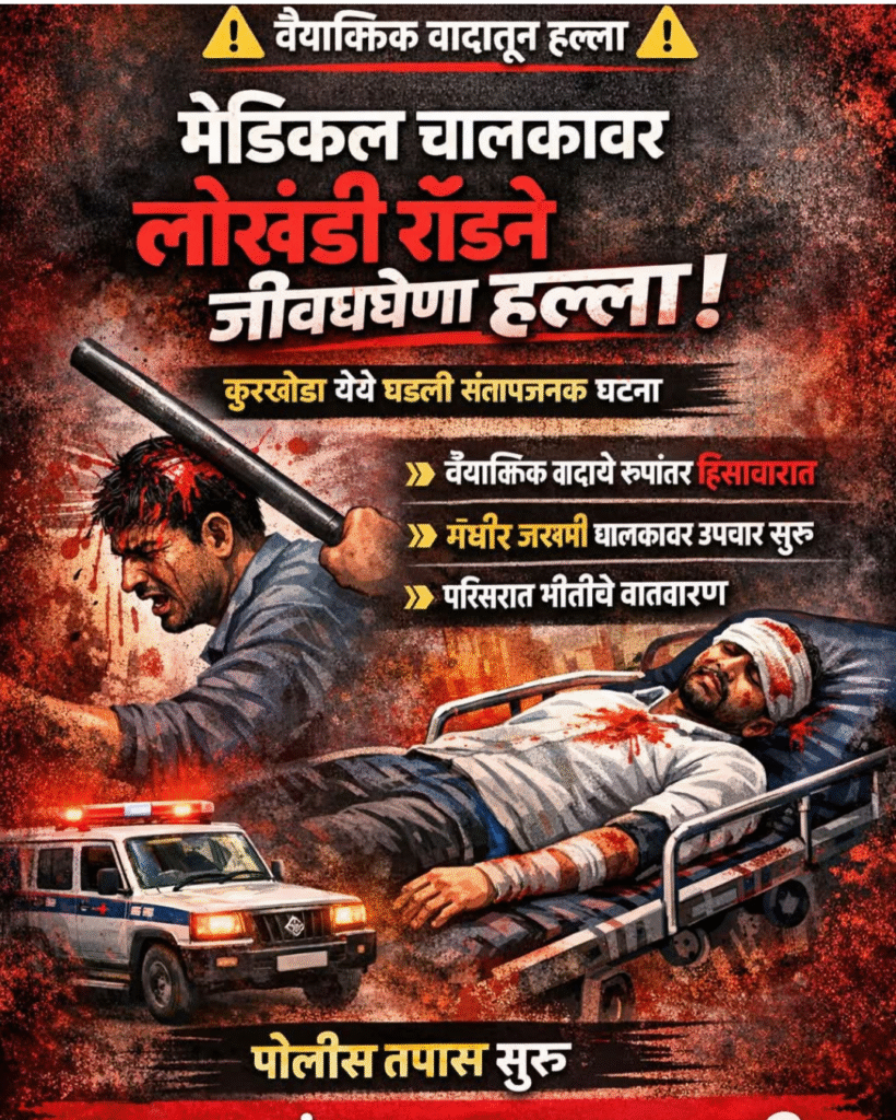 कुरखेडा शहरात दि. १४ एप्रिल रोजी दुपारी १२ वाजेच्या सुमारास एका मेडिकल चालकावर लोखंडी रॉडने जीवघेणा हल्ला झाल्याची धक्कादायक घटना घडली आहे. योगेश कवाडकर असे जखमी मेडिकल चालकाचे नाव आहे.घटनेचा तपशील:योगेश कवाडकर हे आपल्या मेडिकल दुकानात बसलेले असताना पाच जणांच्या टोळीने त्यांना बाहेर बोलावले आणि कोणत्याही कारणाशिवाय लोखंडी रॉडने मारहाण करण्यास सुरुवात केली. या हल्ल्यात योगेश कवाडकर गंभीर जखमी झाले असून, त्यांच्या मदतीला धावून आलेल्या त्यांच्या वडिलांनाही हल्लेखोरांनी मारहाण केली.वैद्यकीय स्थिती:रक्तबंबाळ अवस्थेत योगेश यांना तातडीने उपजिल्हा रुग्णालयात दाखल करण्यात आले. त्यांच्या डोक्याला गंभीर दुखापत झाली असून डॉक्टरांनी त्यांना ८ टाके घातले आहेत.वादाची पार्श्वभूमी:प्राथमिक तपासानुसार, हा हल्ला जुन्या कौटुंबिक आणि वैयक्तिक वादातून झाला असल्याचे समोर आले आहे. आश्चर्याची बाब म्हणजे, हल्ला करणाऱ्या पाचही जणांनी स्वतः पोलीस ठाण्यात जाऊन जखमी योगेश कवाडकर यांच्या विरोधातच तक्रार दाखल केली आहे.