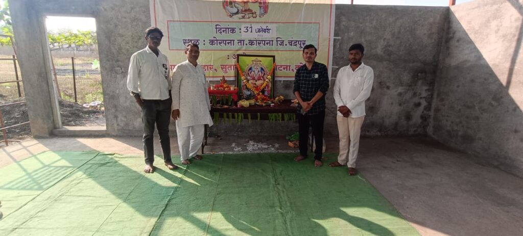 कोरपना कोरपना येथे श्री प्रभु विश्वकर्मा लोहार व सुतार झाडे समाज कोरपना तालुक्यातील सर्व समाज बाधव एकञित येवुन दरवर्षी प्रमाणे यावर्षी मोठ्या उत्साहात श्री प्रभु विश्वकर्मा जंयतीचा कार्यक्रम मोठया उत्साहात श्री,गजानन महाराज मंदिर ग्रामीन रुग्णालय कोरपना येथे मोठ्या उत्साहात संपन झाला यावेळी डाँ दिपक मेश्राम दिपक पेटकर जगदीश वाघाडे संतोष हंसकार अमोल बावणे मनोहर पेटकर जगदिश पेटकर टिकाराम धुर्वे सागर धुर्वे राजुभाऊ मानुसमारे पंकज धुर्वे ज्ञानेश्वर हंसकार धनराज हंसकार अनंत वाघाडे मिनाथ पेटकर दिपक सोनटके अवीनाश वाघाडे रघु दुरुतकर देवराव सोनटक्के संदिप मानुसमारे मारोती सुरतीकार व सर्व लोहार समाज बाधव उपस्थीत होते