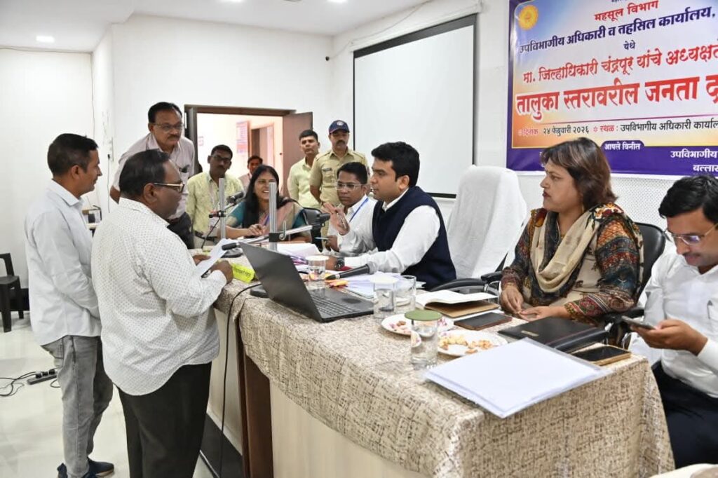 चंद्रपूर:-दि. 24 नागरिकांच्या तक्रारींचे स्थानिक स्तरावर निराकरण व्हावे, त्यांच्या समस्या यंत्रणेने जाणून घेऊन, त्या जागच्या जागी सोडविण्यासाठी कार्यवाही करावी, यासाठी जिल्हाधिकारी विनय गौडा जी. सी. यांच्या अध्यक्षतेखाली बल्लारपूर उपविभागीय अधिकारी कार्यालय येथे जनता दरबारचे आयोजन करण्यात आले होते. यावेळी जिल्हाधिकारी श्री. गौडा यांनी नागरिकांच्या तक्रारी ऐकून त्यावर त्वरीत कार्यवाही करण्याचे निर्देश संबंधित यंत्रणेला दिले.